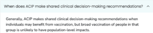At the same time, it is important to recognize a key distinction in how vaccine recommendations are made. “Individually based” shared clinical decision‑making (SCDM) recommendations are generally reserved for situations in which “broad vaccination of a group is unlikely to have population – level impacts.”