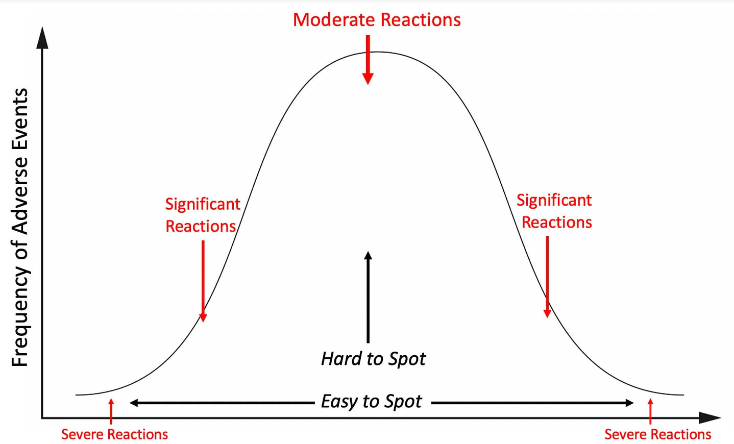 Anytime something injures human beings (unless it’s highly lethal), less severe reactions will be much more common than severe injuries (e.g., far more were disabled than killed by the COVID vaccines).5