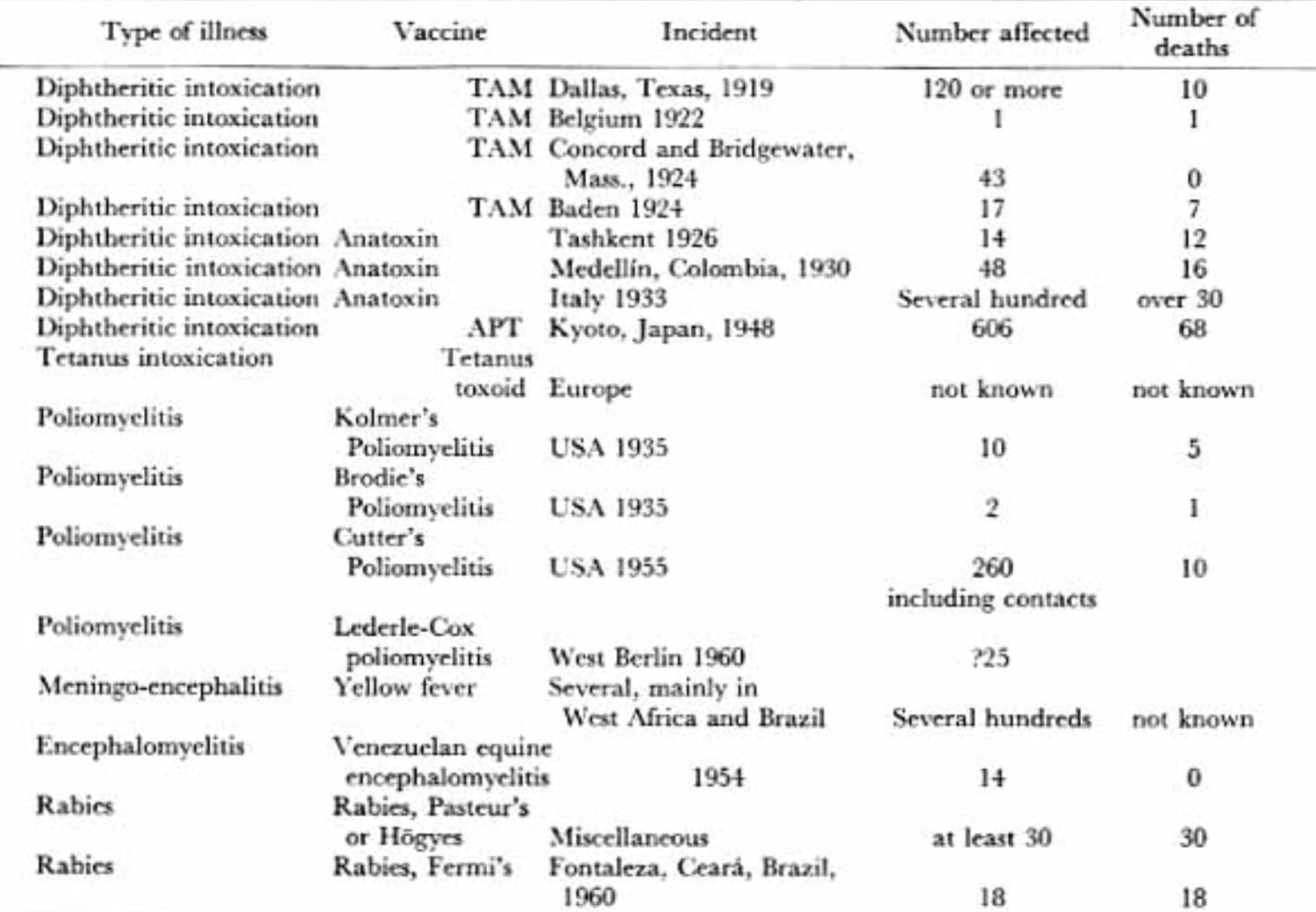 • In 1922 a 14-year old in Belgium was injected with a vial of diphtheria toxin (receiving at least 100 times the lethal dose) that had somehow gotten into a batch of tetanus vaccines, and died seven days later from cardiac paralysis.